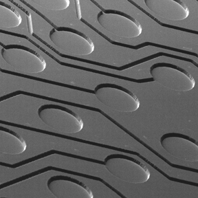 Scanning electron micrograph showing 12 µm wide traces and 250 µm diameter pad lands patterned by photoablation in 15 µm thick polyimide with the Anvik HexScanTM 4050 SXE high-throughput, high-resolution, large-area photoablation system.